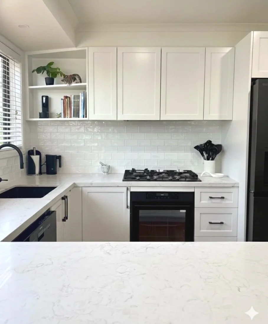 Concept: We moved away from the heavy tones of the past, opting for a Hampton-style shaker profile to introduce texture and architectural depth. To brighten the heart of the home, we finished the cabinetry in a premium white 2-pack paint. This choice wasn't just about aesthetics; the 2-pack finish provides a superior, hard-wearing surface that offers a soft, luminous glow, perfectly echoing the natural light typical of Macleod’s hilltop positions.